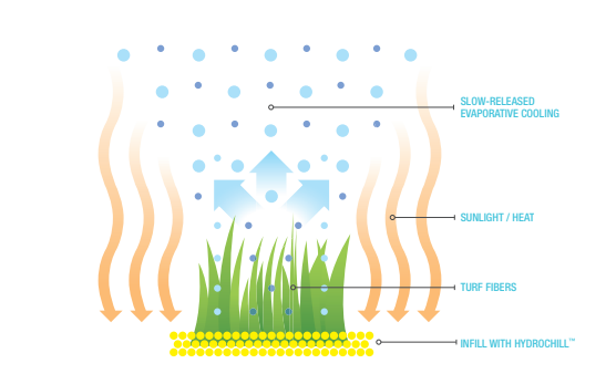 Hydrochill is a groundbreaking technology thats added to the turf's infill that utilizes the energy of evaporative cooling. Hydrochill works in the same way as how sweating cools you. As the artificial turf is warmed up by the sun (solar radiation), moisture that is stored in the surface treated with Hydrochill is released to eliminate the warmth and leave a cooler, more comfortable surface.