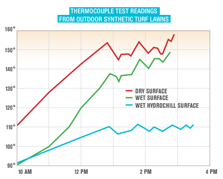 Ambient heat outdoors does not entirely dictate surface temperatures. Over time, the suns angle, solar radiation (sunlight), wind, cloud cloud cover, and many other components impacts the surface temperature. Hydrochill utilizes water to give a cooling effect. This moisture comes from irrigation, dew, or rainfall to keep an artificial grass surface chill for days, based on weather conditions. It offers its greatest advantages during the hottest part of the day.